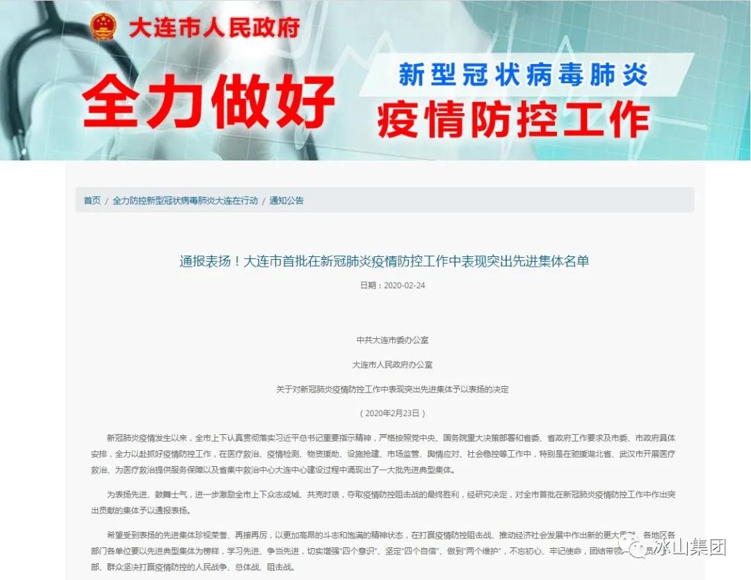 2月24日,大连市人民政府官方网站发布了《通报表扬!大连市首批在新冠肺炎疫情防控工作中表现突出先进集体名单》通知公告,表扬了在新冠肺炎疫情防控工作中表现突出的16家先进集体,大连冰山集团有限公司名列其中。