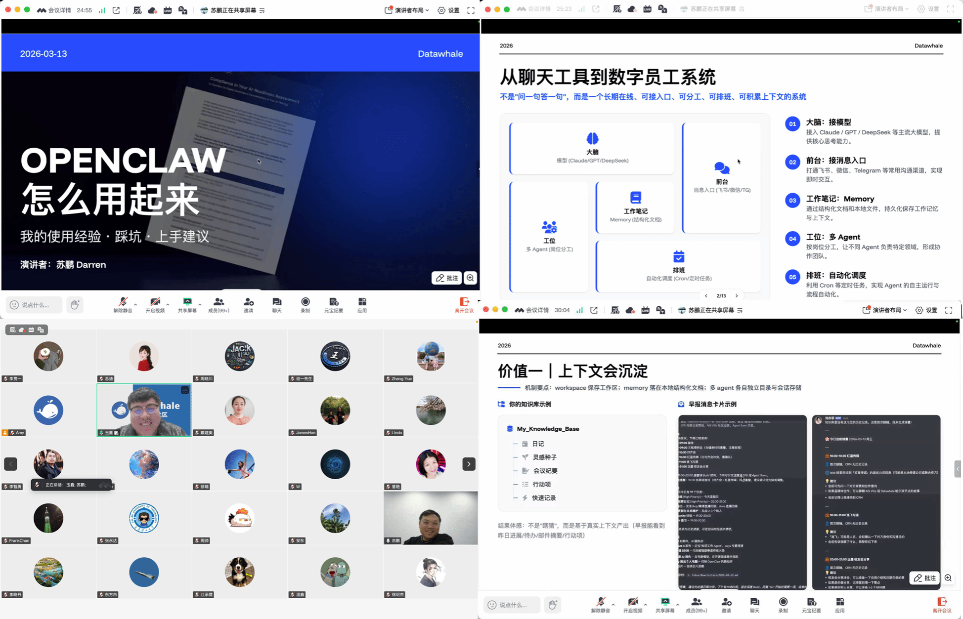 本次沙龙由大工创业校友会联合Datawhale举办,聚焦人工智能前沿工具OpenClaw的落地场景、安全风险及实操应用。支部党员通过听取16级软件工程校友司玉鑫、Datawhale城市负责人苏鹏等专家的分享,深入了解了AI技术在资源汇聚、场景落地中的应用潜力。