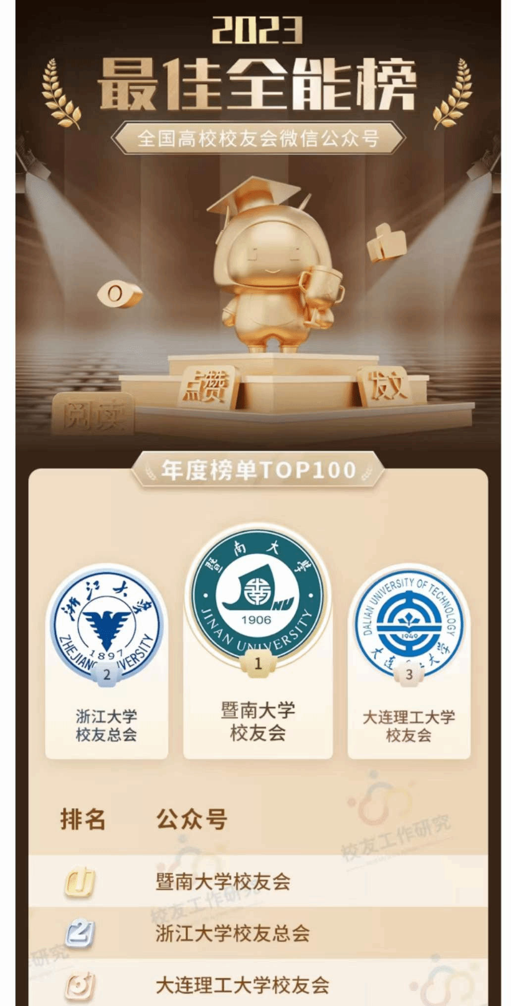 “校友会公众号排行榜”是基于“校友工作研究”平台历时六年收集的全国高校校友会公众号样本库最终产生,目前全国共有400多个高校校友会公众号参与排名。