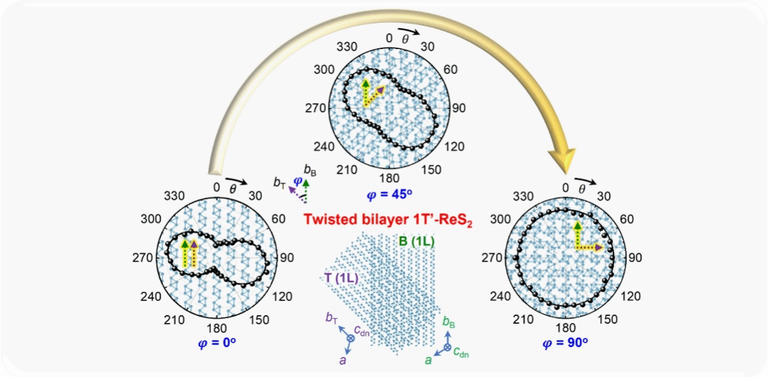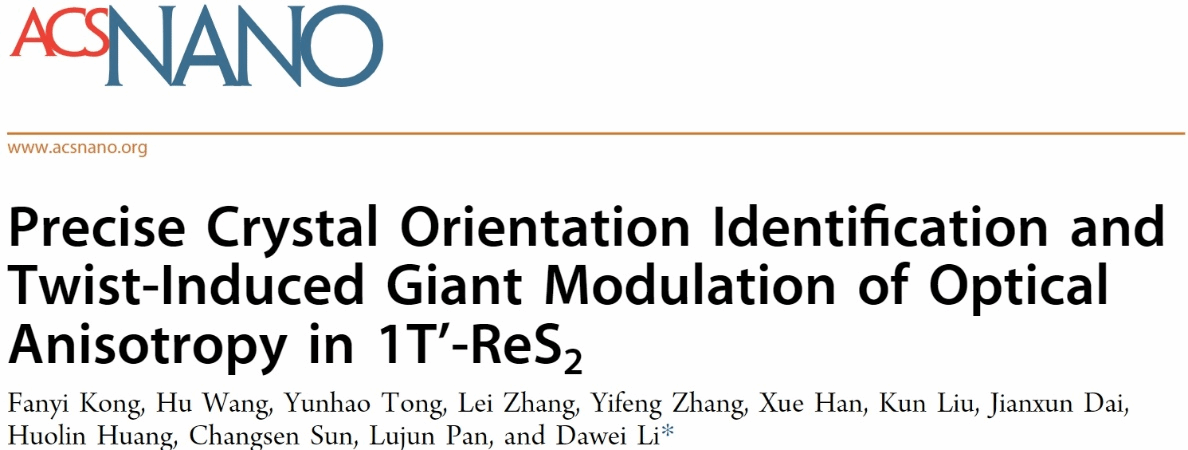 该团队报道了一种改进的偏振光学成像方法,能够同时识别单层到几层ReS2的面内晶轴取向和面外晶轴取向,同时提出了一种通过扭曲堆叠来调整ReS2光学各向异性的非破坏性方法。