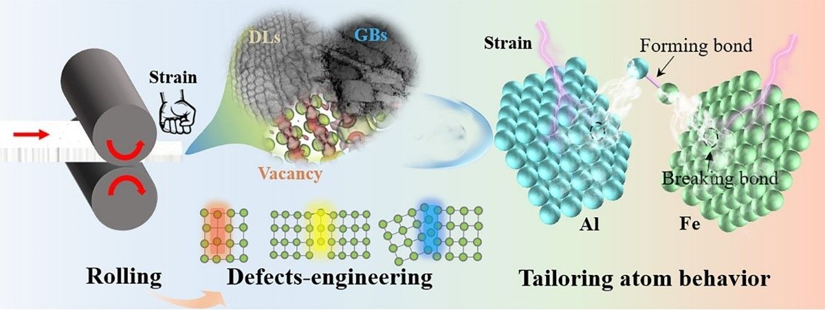 该研究团队提出了一种应变介导的缺陷工程诱导原子快速扩散策略,即通过累积轧制技术对Fe和Al施加应变,实现降低空位活化能并增强原子沿位错和晶界扩散行为的目的。