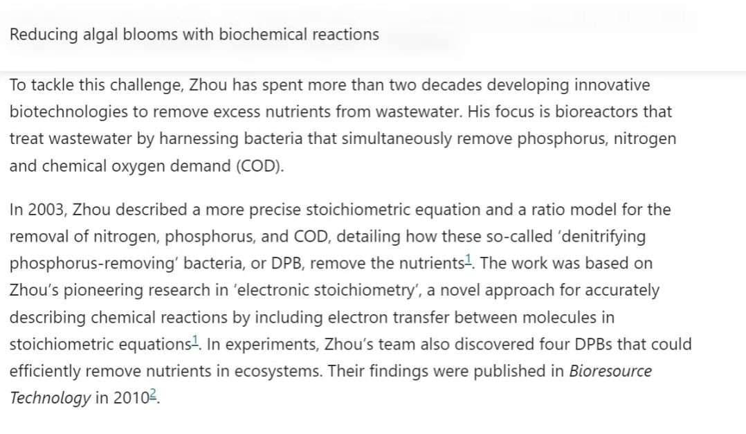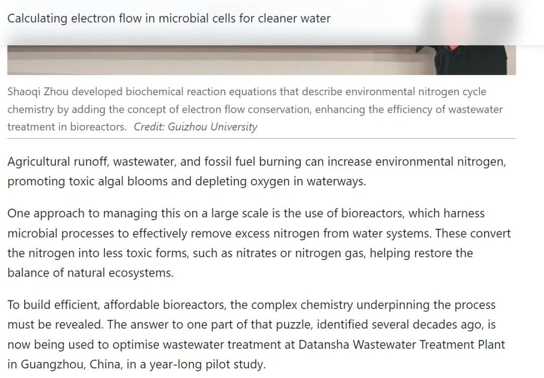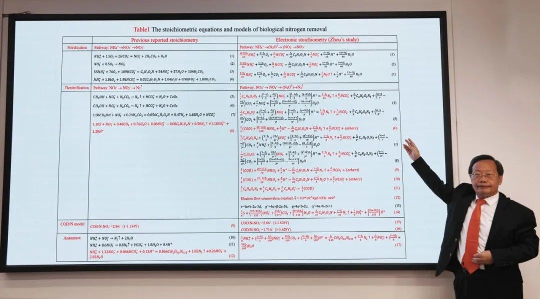 文章提到,周少奇教授“开创性地提出了更加精准分析氮、磷和COD同步去除过程的化学计量方程和计量比模型(COD/N/P),详细描述了所谓的反硝化除磷菌(DPB)如何去除营养物质。这一成果基于他在‘电子计量学’领域的开创性研究。这种原创方法通过在化学计量方程研究中分析分子间的电子迁移来精准描述化学反应”。