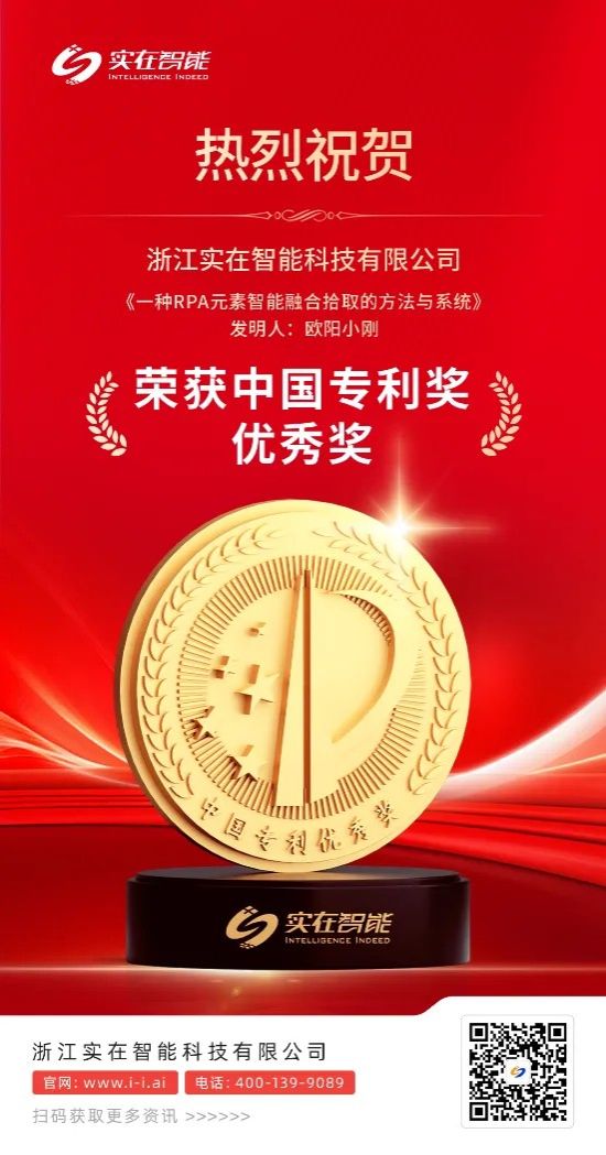 近日,国家知识产权局正式发布 “第二十五届中国专利奖评审结果公示” 信息,实在智能发明专利 “一种 RPA 元素智能融合拾取的方法与系统(专利号:ZL202110944521.2)” 荣获中国专利奖,这是实在智能首次荣膺中国专利奖,也是业界首获该荣誉。