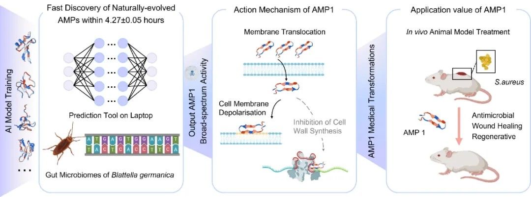 本研究利用开发的AI工具“AMPidentifier”,从德国小蠊的肠道微生物组中筛选候选AMPs分子,并在体内外验证其活性。结果发现,来自共生微生物Blattabacterium cuenoti的AMP1表现出广谱抗菌活性,同时对哺乳动物细胞的毒性低,且不具有溶血作用。机制研究表明,AMP1能够迅速穿透细胞膜并在胞内积累,且能引起细菌细胞膜逐渐去极化,但对膜的完整性影响较小。通过荧光显微镜和扫描电镜观察发现,AMP1干扰了细菌的二分裂过程,推测AMP1可能通过抑制细菌细胞壁合成来发挥作用。此外,AMP1在小鼠模型中展现出强效的抗菌和伤口愈合作用,其效果与万古霉素相当。本研究展示了一种从天然生物组织中筛选安全有效AMPs的跨学科方法,且鉴定出的AMP1具有广阔的临床应用潜力。