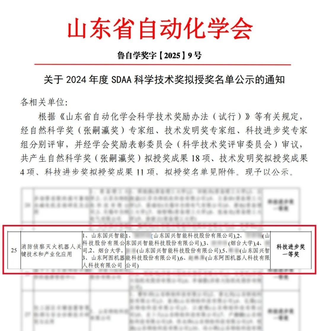 近日,2024年度SDAA科学技术奖评审工作由山东省自动化学会领导开展,国兴智能“消防侦察灭火机器人关键技术和产业化应用”荣获“科技进步奖一等奖”。