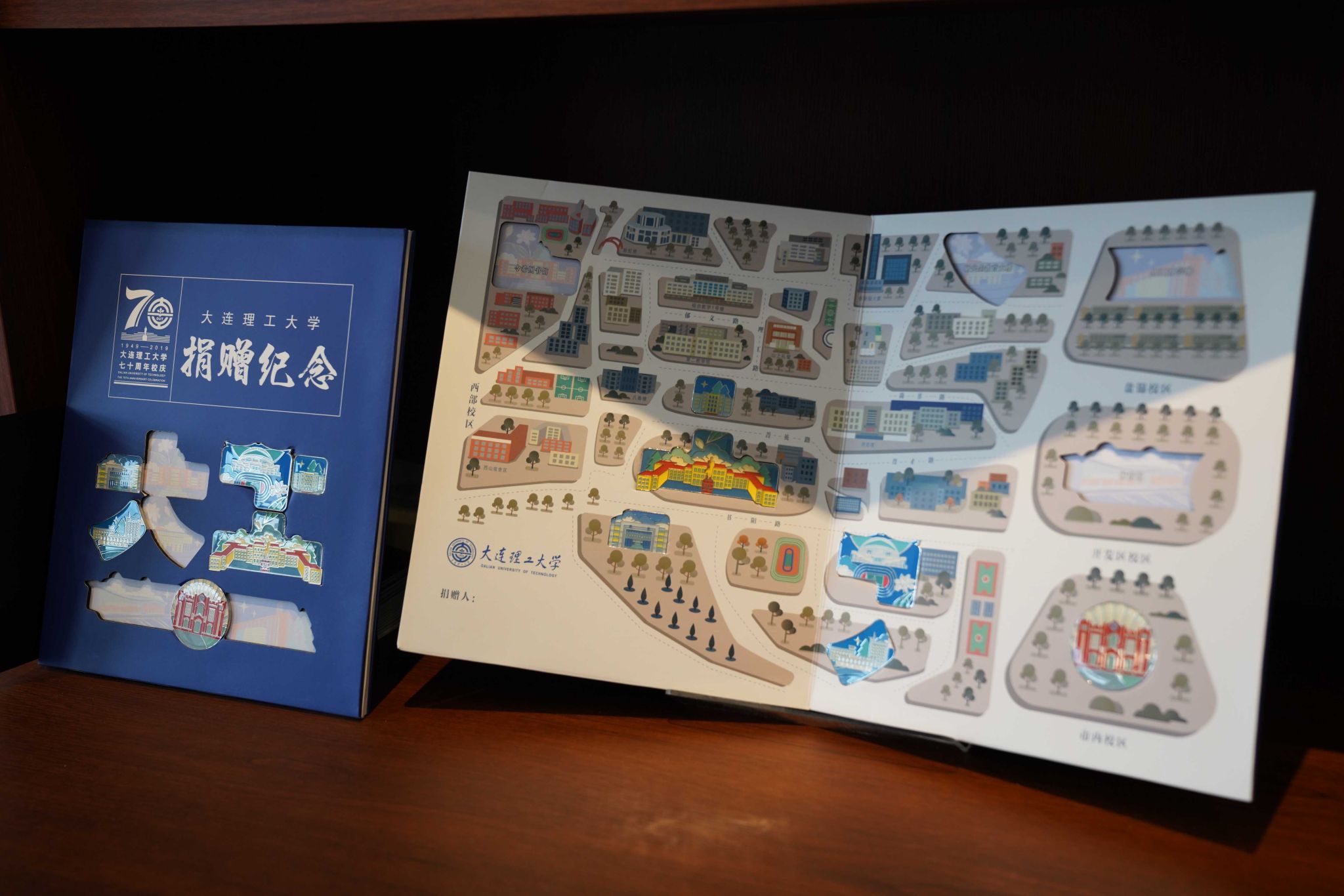 这里集中展示了校友捐赠反馈纪念品,如校友文化衫、连理对戒、援梦专列纪念徽章等特色物品。