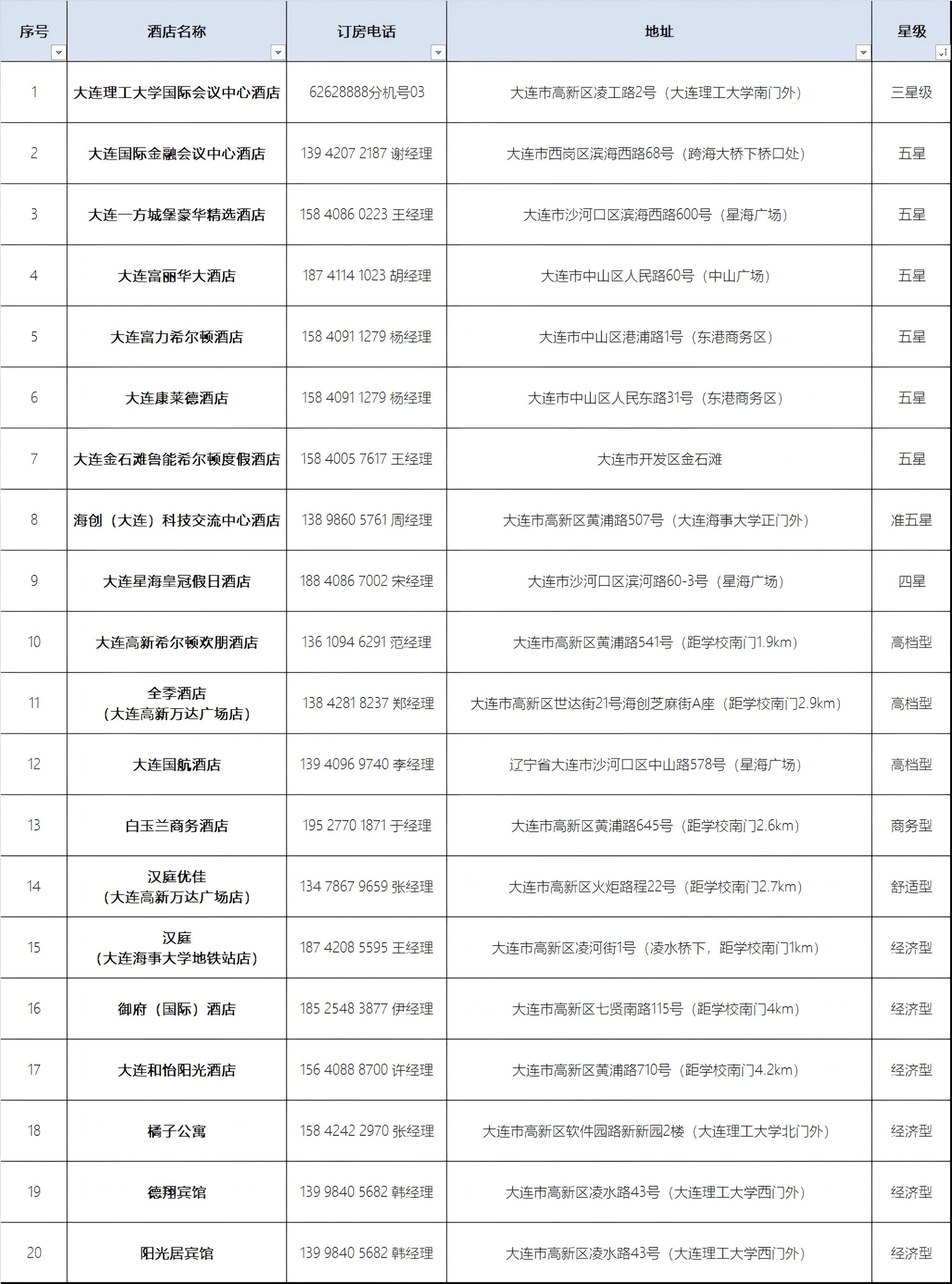 国内合作与联络处联合大连市内及学校周边诸多酒店,为校友们返校提供校友优惠价。请校友提前与各酒店联系预定房间。