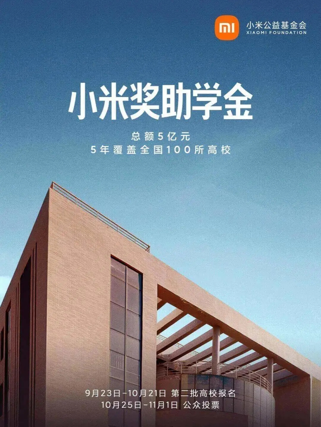为了进一步支持中国高校的建设与发展,鼓励培养科技人才,小米公益基金会自2020年起在高校设立“小米奖助学金”。“小米奖助学金”计划将在“十四五”规划期间,分5年覆盖全国100所高校,资助总金额共计5亿元人民币。2021年9月,小米公益基金会正式开启第二批“小米奖助学金”高校报名活动,以学校自愿报名、公众参与投票的方式,最终确定第二批20所高校名单。