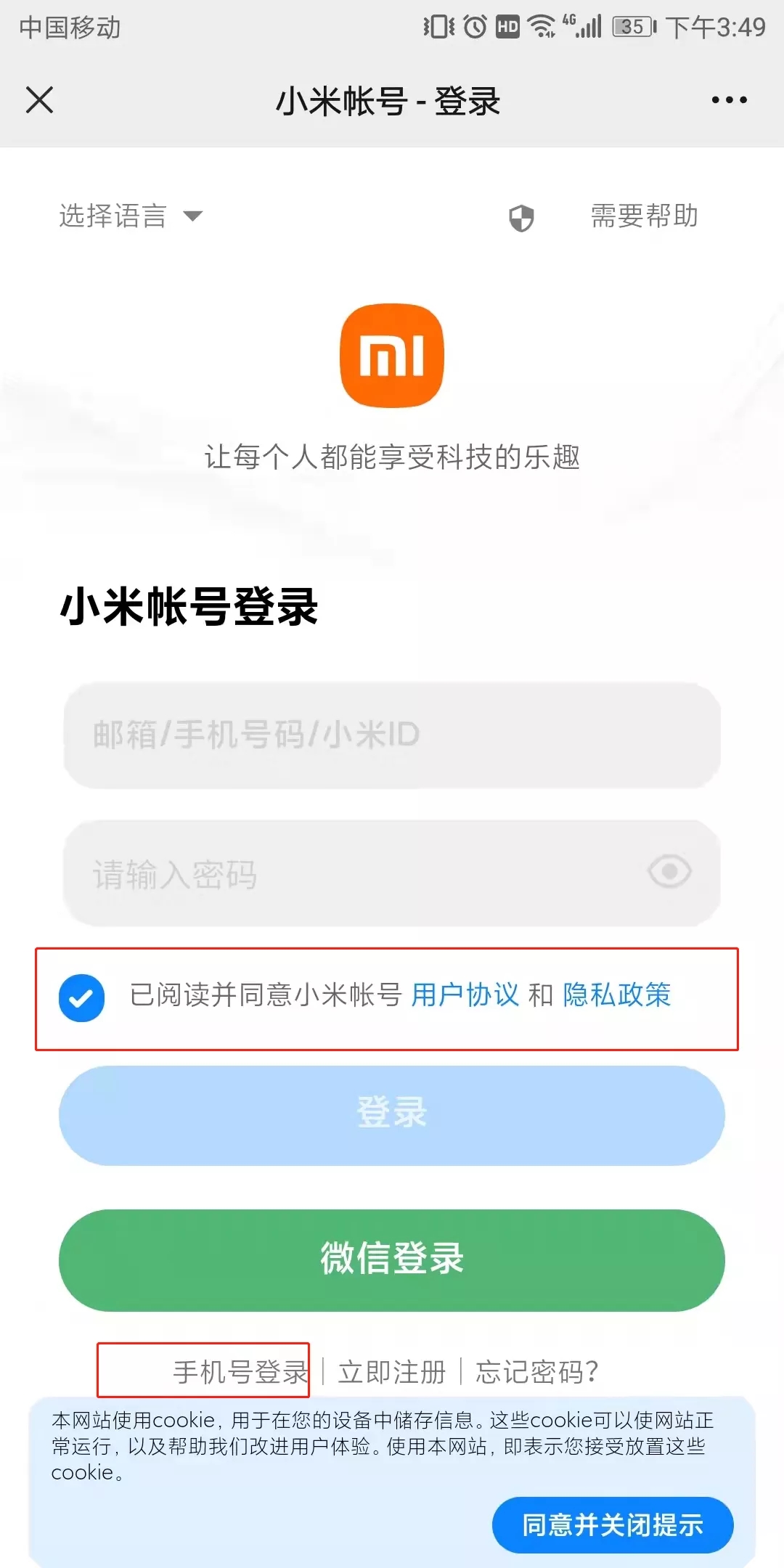 1.勾选“已阅读并同意小米账号用户协议和隐私政策”。