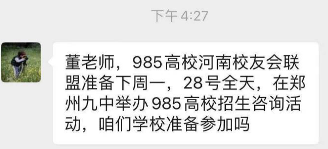 “郑州九中要举办985高校招生咨询活动,咱们学校准备参加么。”