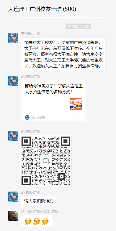 受广东疫情影响,学校招生组无法实地开展招生工作,当地校友们承担起了“主力军”重任。客观困难无法阻断校友助力母校招生的热情,广大校友转战线上,寻优质生源、组建咨询群,为母校招生工作给予全力支持与帮助。