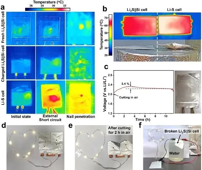 图1.基于硫化锂正极、硅负极与聚合物凝胶电解质的准固态锂二次电池在(a)内、外部短路、(b)过热、(c)剪切后空气静置、(d)穿刺、(e)剪切暴露空气、(f)剪切浸水等滥用条件下的安全性评估