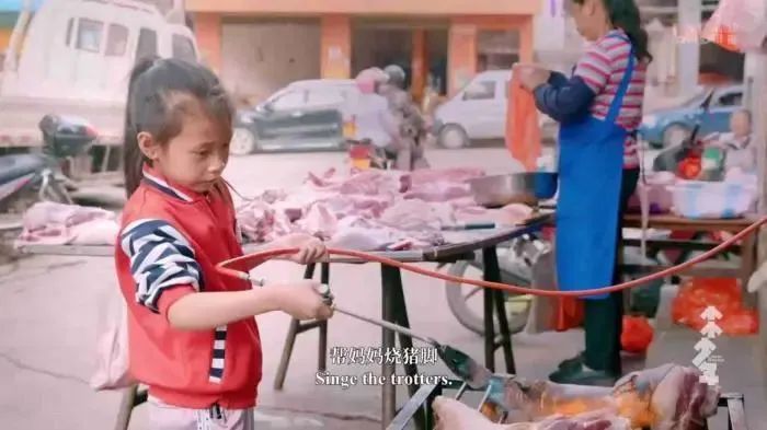 凌晨4:30,远在云南那夺村的九岁女孩小云儿便要起床,跟着妈妈一起来到自家猪肉店,为新一天的生活准备。她熟练地帮妈妈切割猪肉,洗猪大肠,火烧猪脚……一年365天,只得一天休息时间。
