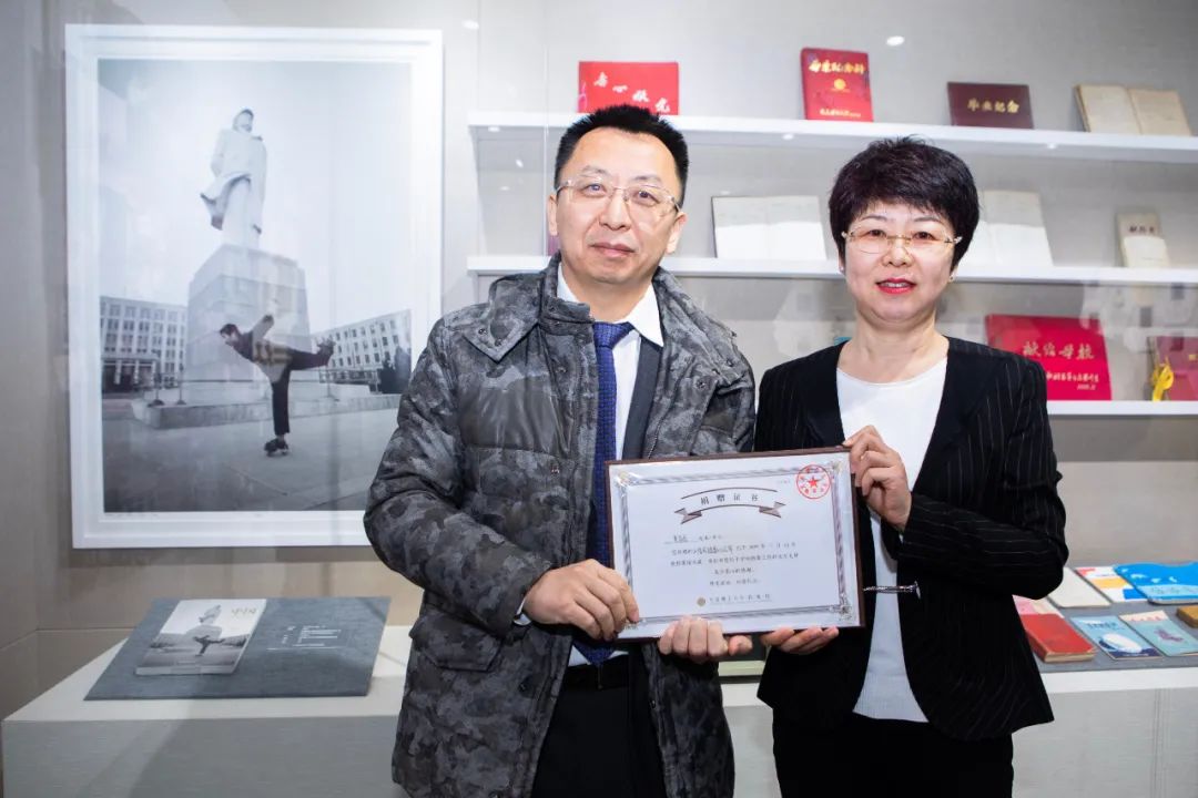 11月29日上午,著名摄影师刘香成摄影作品《滑旱冰经过毛主席像·大连》捐赠仪式在校史馆举行,本次捐赠仪式由校友工作处、档案馆(校史馆)联合举办,我校化工英强专业91级校友吴学亮、校友工作处处长杨克旭、档案馆(校史馆)馆长刘晓梅及校史馆副馆长李哲参加。仪式上,吴学亮校友对捐赠摄影作品做了简要介绍,档案馆(校史馆)馆长刘晓梅代表学校致谢并为吴学亮校友颁发捐赠证书。