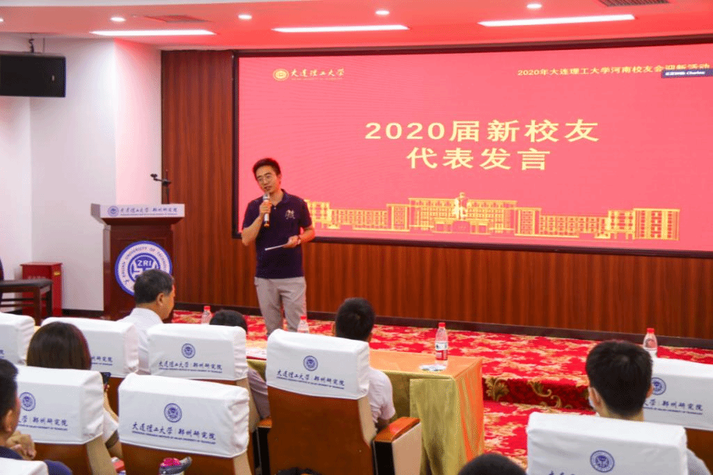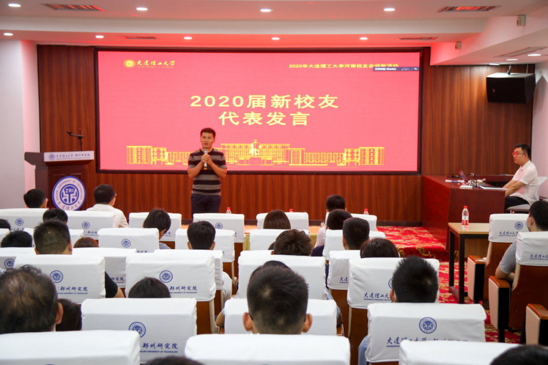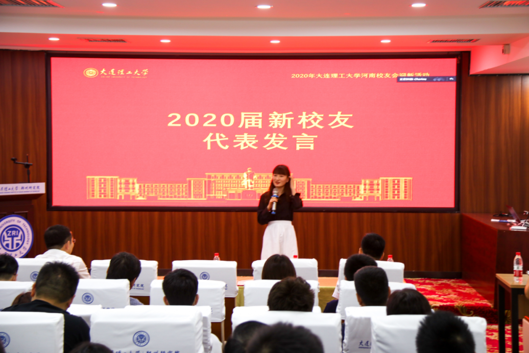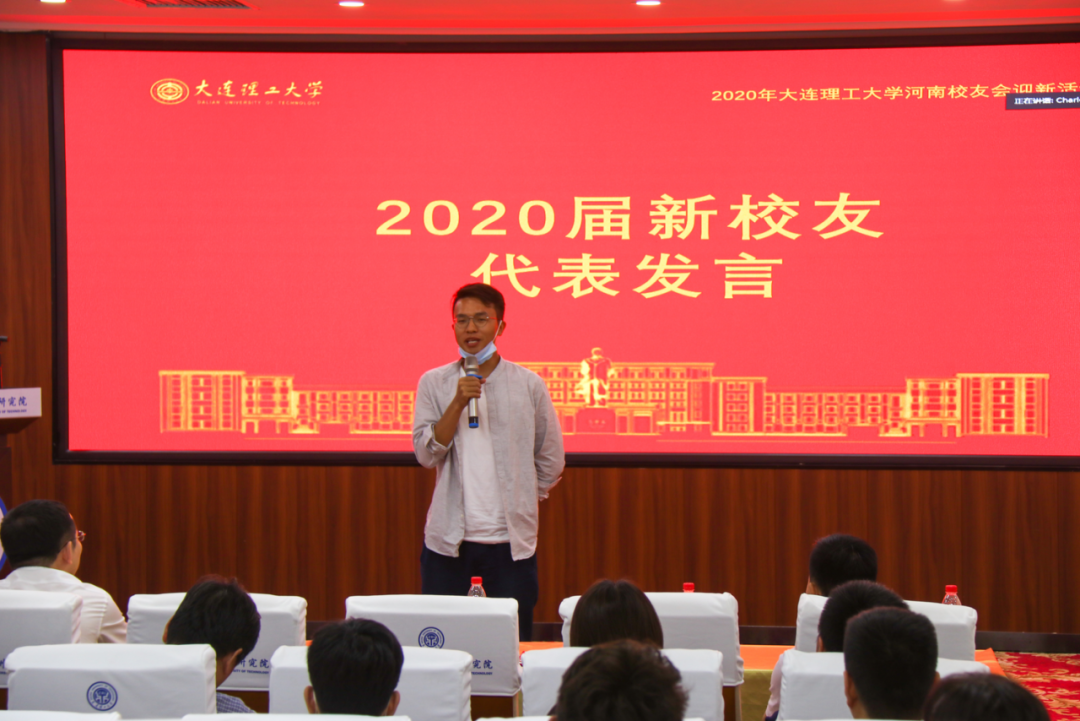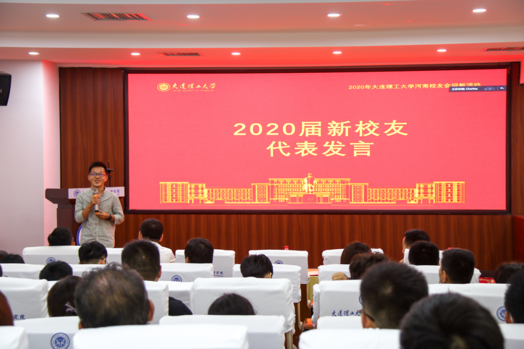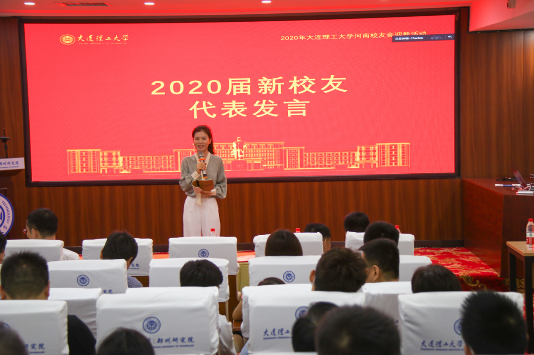 2015届大工本科毕业、2020届清华博士毕业的杨振杰校友,2020届大工硕士毕业、入职国家知识产权局的何泽漫校友,2020届大工硕士毕业、入职碧桂园的孟祥宇校友,2020届大工硕士毕业、入职审协河南中心的丁亚阁校友,2020届大工硕士毕业、入职中铁工程装备集团有限公司的翟锐峰校友,2020届大工硕士毕业、入职三磨所的徐钰淳校友,2020届大工硕士毕业、入职建业的刘肖飞校友等作为2020届新校友代表依次上台发言,表达了对母校大工的不舍和眷恋之情,刚踏上工作岗位的激动和不安,在今后的工作中会继续发扬大工精神,向优秀的师兄师姐学习,争取做出一番成绩,为大工增光添彩。