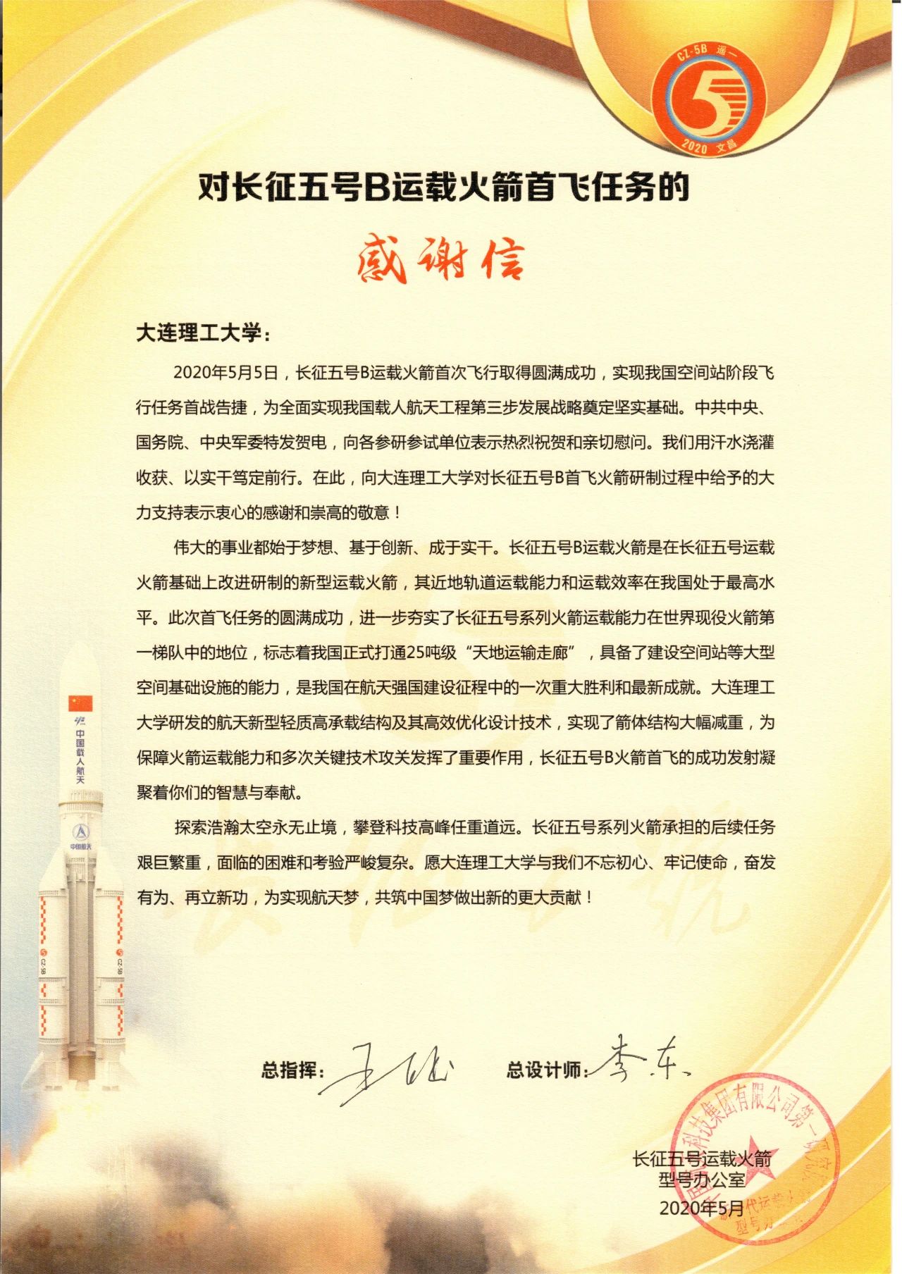 长征五号B运载火箭型号办感谢信