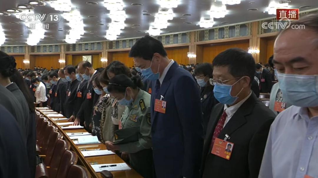 “一批医务人员、干部职工、社区工作者因公殉职,许多患者不幸罹难,我们对新冠肺炎疫情牺牲烈士和逝世同胞表示深切哀悼。请默哀。”全国政协十三届三次会议今天下午在人民大会堂开幕,全场齐唱国歌后,主持人提议全场默哀。