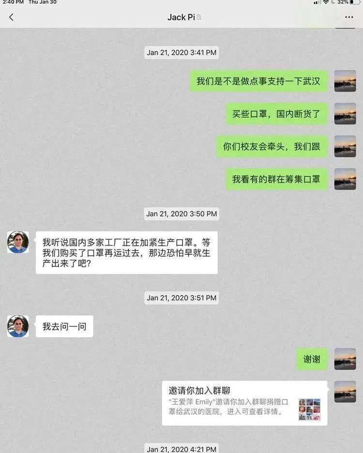 一月十七号北大校友方晓蕊在朋友圈说CDC(美国疾控中心)将派100多人去洛杉矶纽约西雅图三大机场检测病毒,这个时候我才正式开始警觉武汉的疫情。也就在这个时候,有个昵称是“拔牙”的群友在群里贴了”捐赠-给武汉的医院”群二维码,我于是进入了这一个群,群主就是大名鼎鼎的郭奕教授,她就职梅奥诊所。郭教授对前线医院精准超前的缺乏防护物资的判断精准超前,召集大家募款支援武汉医院。郭教授在短短的两天时间,募款近五万美元,人民币138万元,用最快的速度购买物资支援到武汉的医院一线,前方由华科大校友卫峰运送、分配物资直接到医院。他在武汉成立了约600个志愿者组成的斑马救援团,从服务医院到方舱再到社区。我每天在这个群里热血澎湃,我想我们高校联盟是不是也可以做些什么事去帮助武汉人民。我在一月二十一号把武汉大学的荣誉会长皮晓青和联盟会长孙军拉到了郭奕的群里。