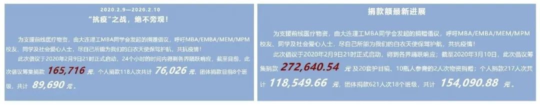 从2月9日21时发起捐赠倡议,仅一天时间就收到捐款165,716元,接下来十余天的日子里,各班级和个人都积极踊跃地捐款捐物。截止到2020年3月10日,大工MBA捐赠总额共计272640.54元。