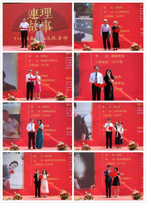 16日上午10:38分,“连理·我们的故事”70对校友伉俪返校活动在音乐喷泉南侧的草坪上如期举行。当熟悉的校歌响起,70对大工伉俪共同携手登上舞台。他们中,有建国初始即相守一生的耄耋伉俪,也有和谐发展年代携手共进的年轻夫妻。7对伉俪代表为我们讲述了从校服到礼服的浪漫,用他们的爱情故事展示了大工人与国连理勇担重任、与校连理同心同行、与尔连理携手一生的大工品格。活动由我校教师伉俪代表,05级数学与应用数学专业校友赵玉鹏和05级电子信息与电气工程学部校友李伟主持。