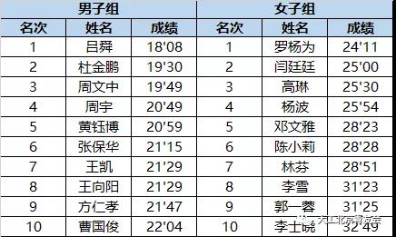 比赛结束后,大家在终点领取纪念奖牌,并进行男女前十名的颁奖仪式,由杨树杉,田熹东两位师兄和杨克旭老师为大家颁奖,以下为本次比赛男女前十名成绩: