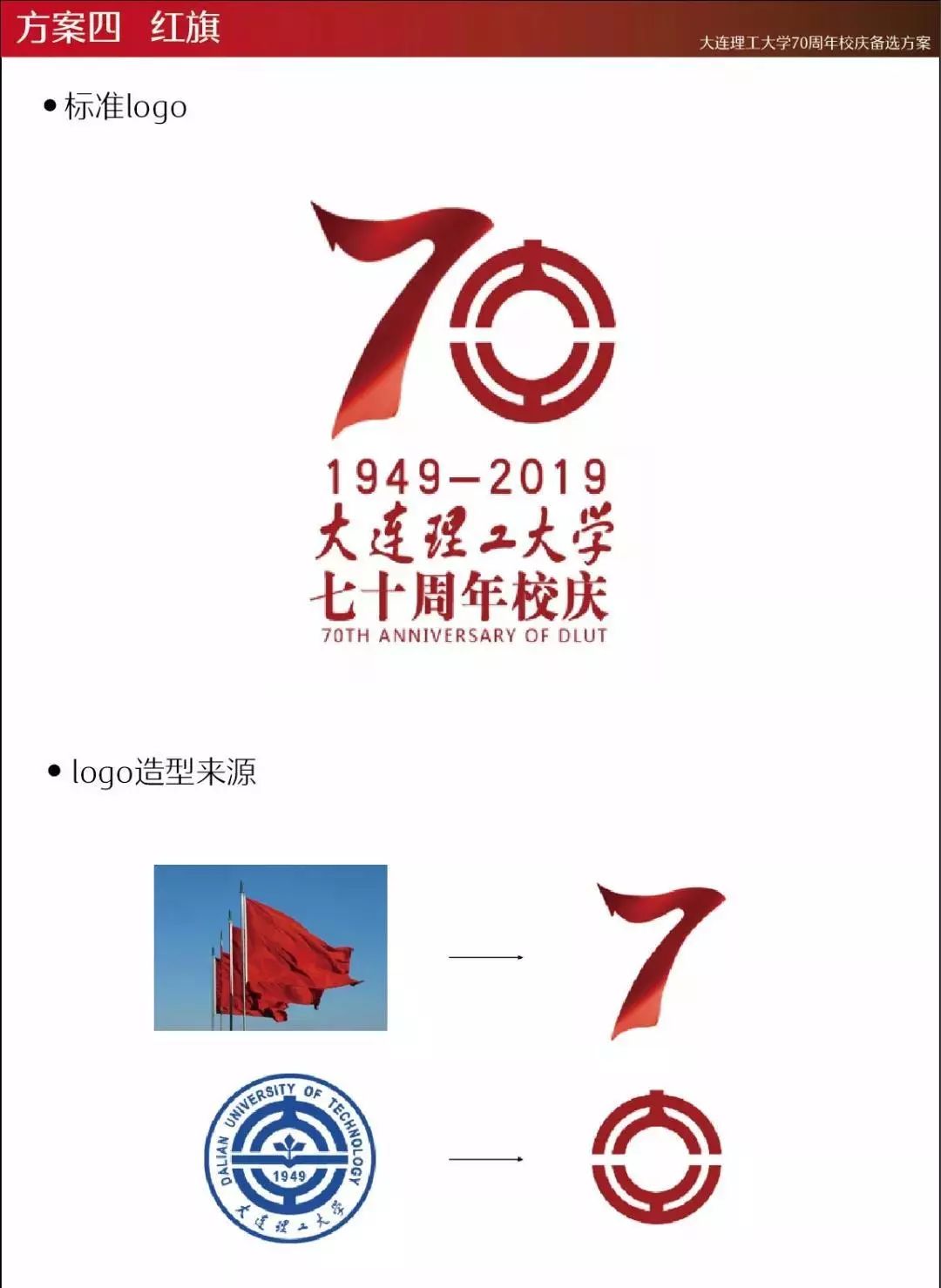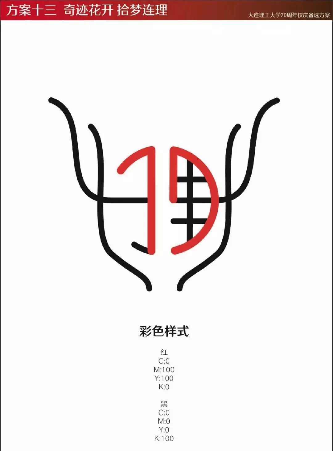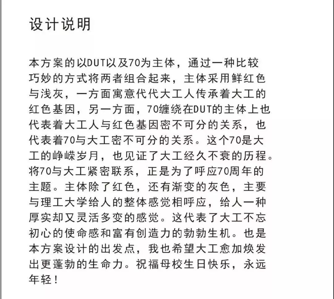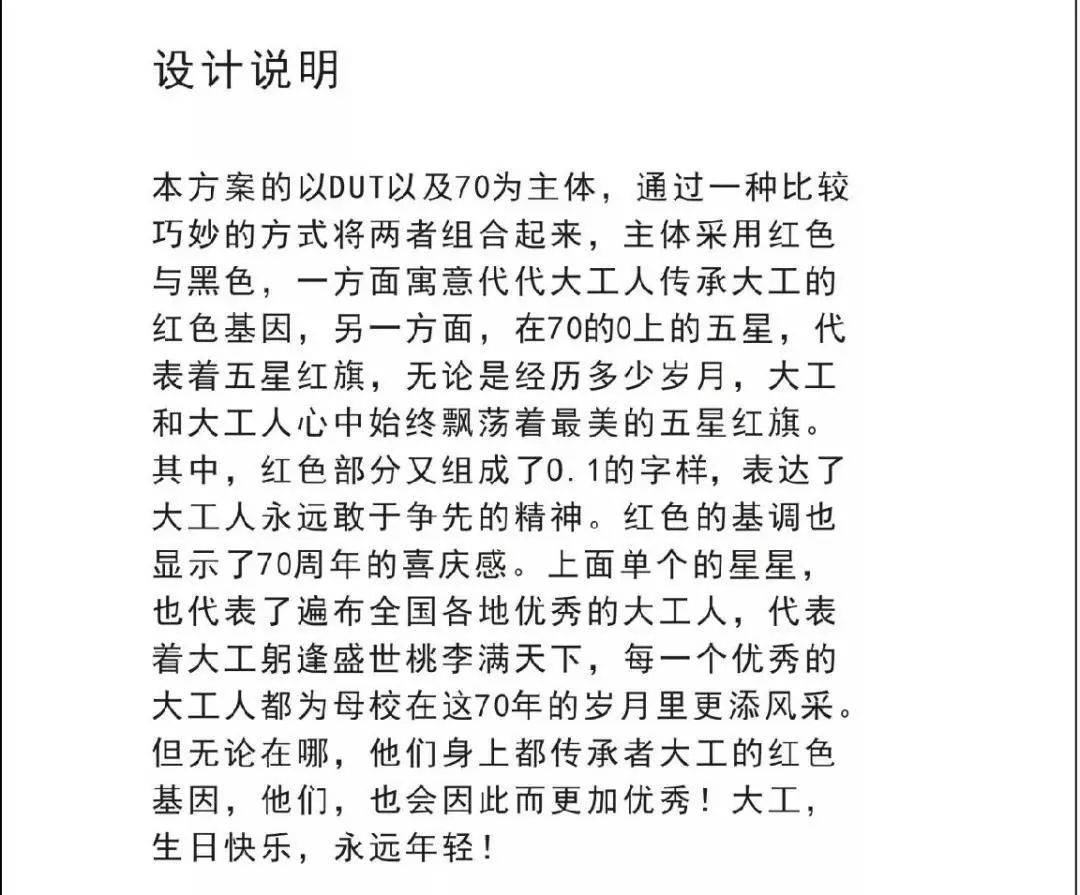 2018年12月,大连理工大学70周年校庆LOGO征集活动正式启动,学校通过主页、“大连理工大学”官方微信公众号等平台同时面向全体师生、海内外校友,以及关心支持学校发展的社会各界人士,公开征集70周年校庆标识(LOGO)作品。截至2019年2月,共收到LOGO设计方案82件。经多轮评议、遴选,最终确定入围作品13件。