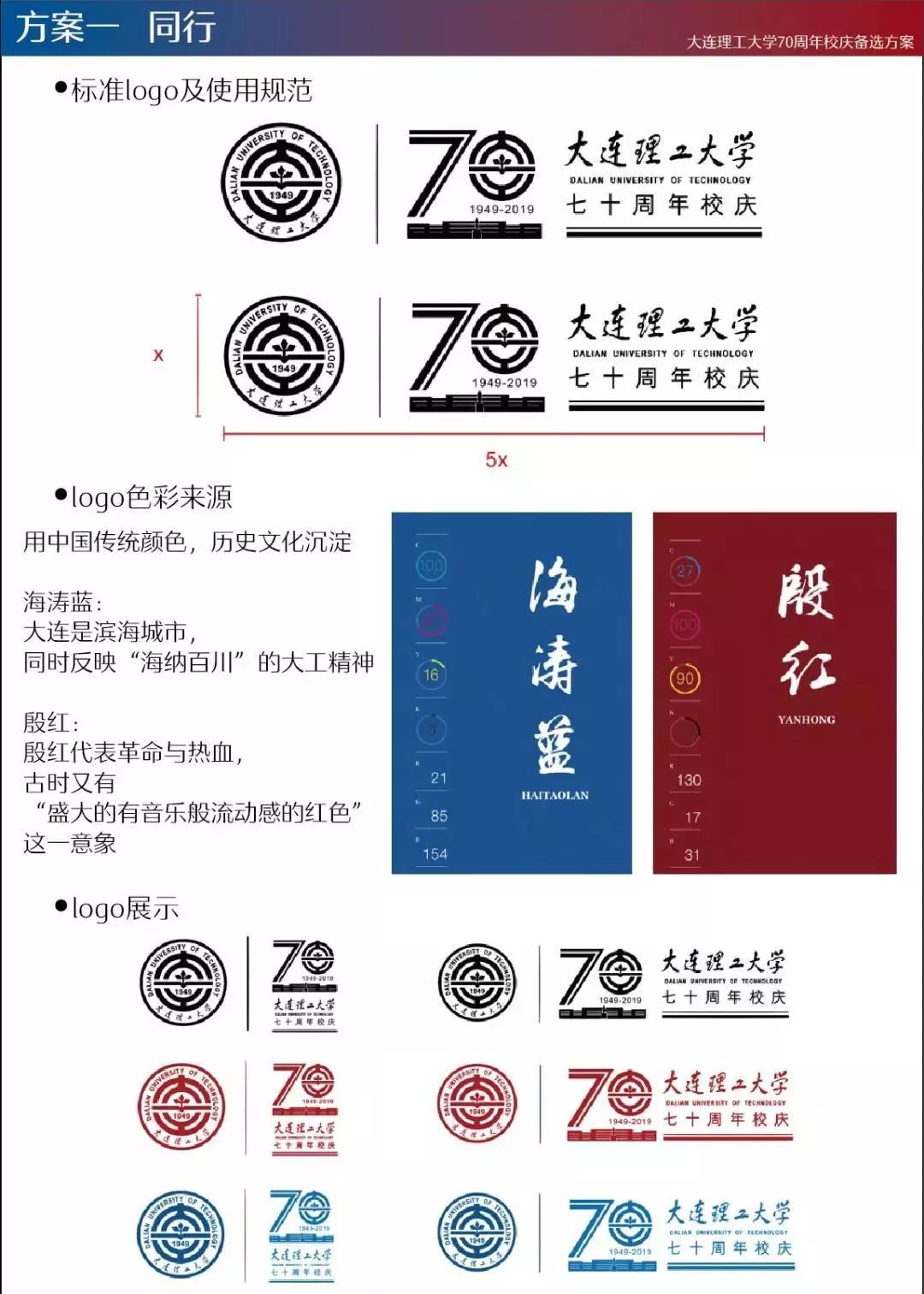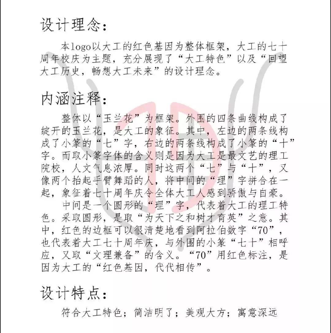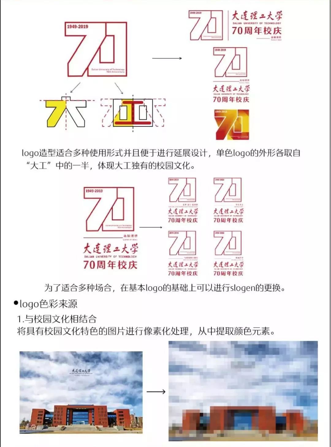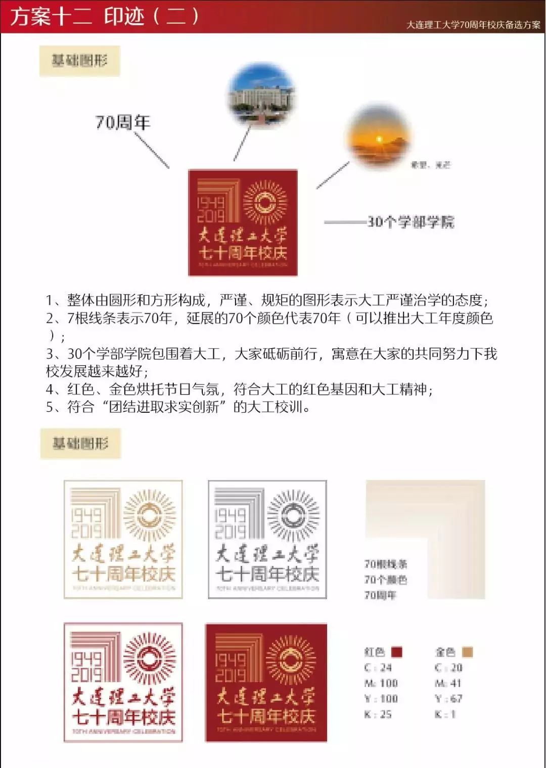2018年12月,大连理工大学70周年校庆LOGO征集活动正式启动,学校通过主页、“大连理工大学”官方微信公众号等平台同时面向全体师生、海内外校友,以及关心支持学校发展的社会各界人士,公开征集70周年校庆标识(LOGO)作品。截至2019年2月,共收到LOGO设计方案82件。经多轮评议、遴选,最终确定入围作品13件。