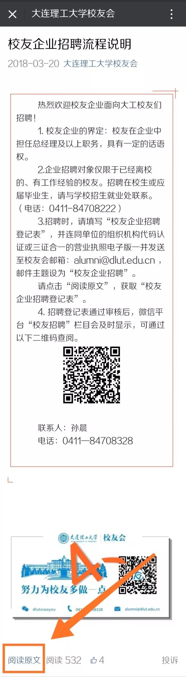 企业可以在公众号“校友求职”一栏当中发布招聘信息,标明招聘需求、联系方式等,面向大工校友吸纳优秀人才。具体步骤为:点击“校友企业招聘”一栏,进入推送,根据推送内容准备相关材料发送到指定邮箱,审核结果通过文中二维码查询。