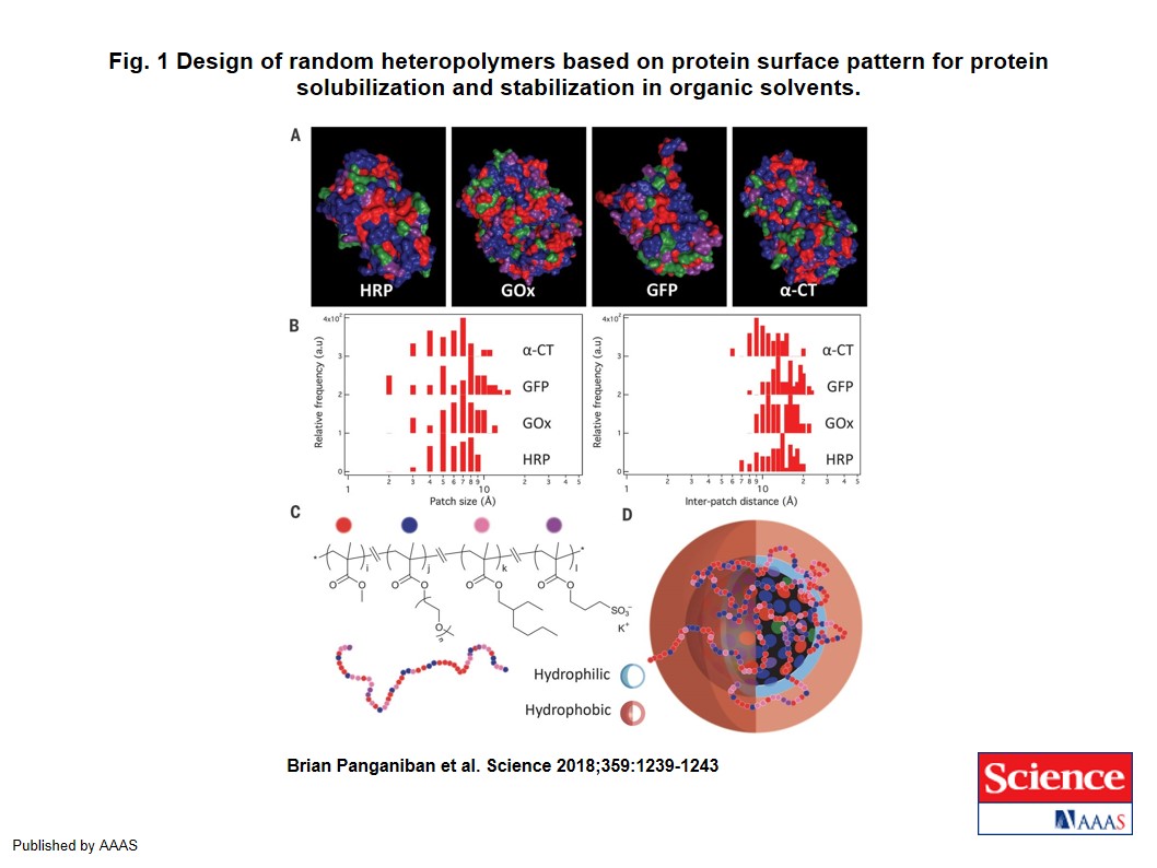 近年来,徐婷教授课题组发挥自身在高分子材料等领域的研究优势, 针对如何提高蛋白质在细胞外的活性等问题开展深入研究,并在仿生蛋白材料的合成领域取得重大突破。研究表明,这种被称为“无规则杂聚合物”的合成高分子材料是一种类似“项链”的柔性材料,由4种单体官能团组成。这些官能团分别可与目标蛋白质表面亲水或疏水的化学键发生相互作用,保持水溶性蛋白质在有机溶液中的活性,让蛋白质在细胞外发生特定的生化反应,让合成材料能够与蛋白质高效结合。