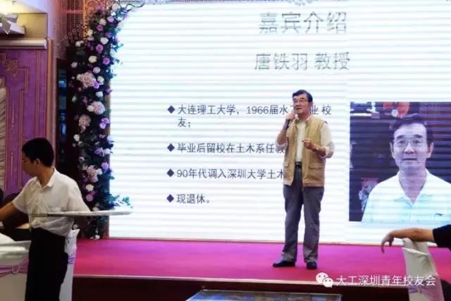 校友会,就是要讲究传承,迎接新校友,同时也要请资深老校友为我们进行经验的传授。聚会这天就十分有幸邀请到了1966届的水工专业校友,唐铁羽教授,唐老如今已经退休在家,但是仍然十分挂念着在深圳的校友们。唐老表示自己今年75岁,但是丝毫没有与时代脱节,微信聊天,上网关注热点样样精通。他说自己特别喜欢与年轻人在一起,显得自己也很年轻,今天有200多名年轻的面孔在这里,唐老很开心,希望可以在今后多多参加这样的活动,也能为年轻的校友们提供力所能及的支持。