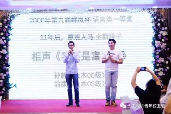 分享结束后,由在2006年第九届峰岚杯上取得了语言类一等奖的建工校友翁康和孙毅,在经过了11年后,再次联手带来的相声《我不是富二代》。在相声的段子与现场的笑声与掌声中,大家仿佛又一次回到了学校,回到了峰岚杯那精彩纷呈的舞台。