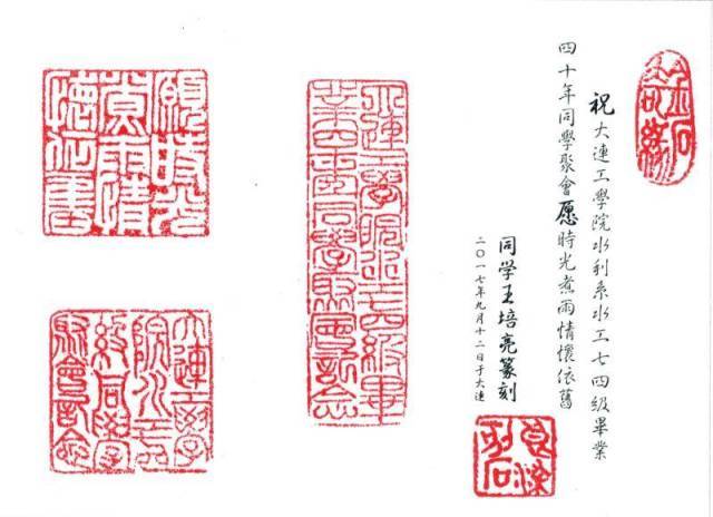 校友阮桂生为毕业四十年同学聚会献诗《相聚话心声》,王培亮为毕业四十年同学聚会献篆刻《大连工学院水工七四级毕业四十年同学聚会纪念》《愿时光煮雨情怀依旧》。