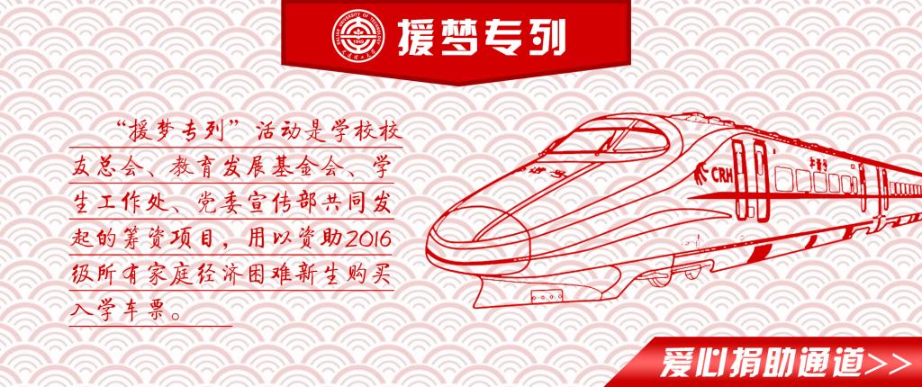 2016年“援梦专列”项目是由我校校友、在校师生和社会爱心人士捐赠的爱心资助项目,用以资助2016级所有家庭经济困难新生(本科)的入学交通费。7月4日,2016“援梦专列”项目正式启动。近千名大工人齐心协力慷慨解囊,短短23天内就筹集善款201047.64元,共资助新生464人,累计资助金额169506.85元。