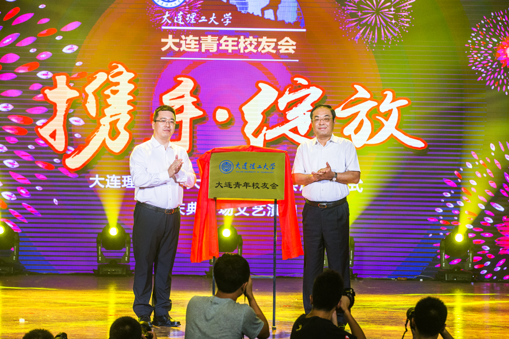 校党委常务书记姜德学与大连青年校友会首届理事长张永滨为大连理工大学大连青年校友会揭牌。