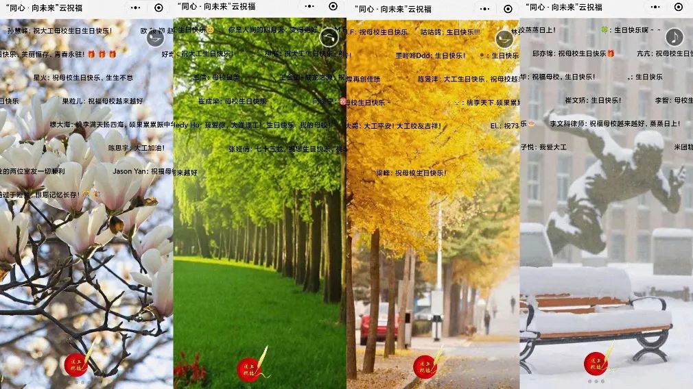 玉兰花开之际,近千名大工人开启“云祝福”页面,以弹幕形式在“云端”表白母校,别致又浪漫。“凌河秀,鸿志酬。大工俊杰,异彩耀神州。”“身虽不能往,心却向往之。”“桃李满天扬四海,硕果累累振中华。”等等祝福语充溢屏幕,饱含大工人内心深处对母校最为深情的告白和祝福。大工人,心连一脉。