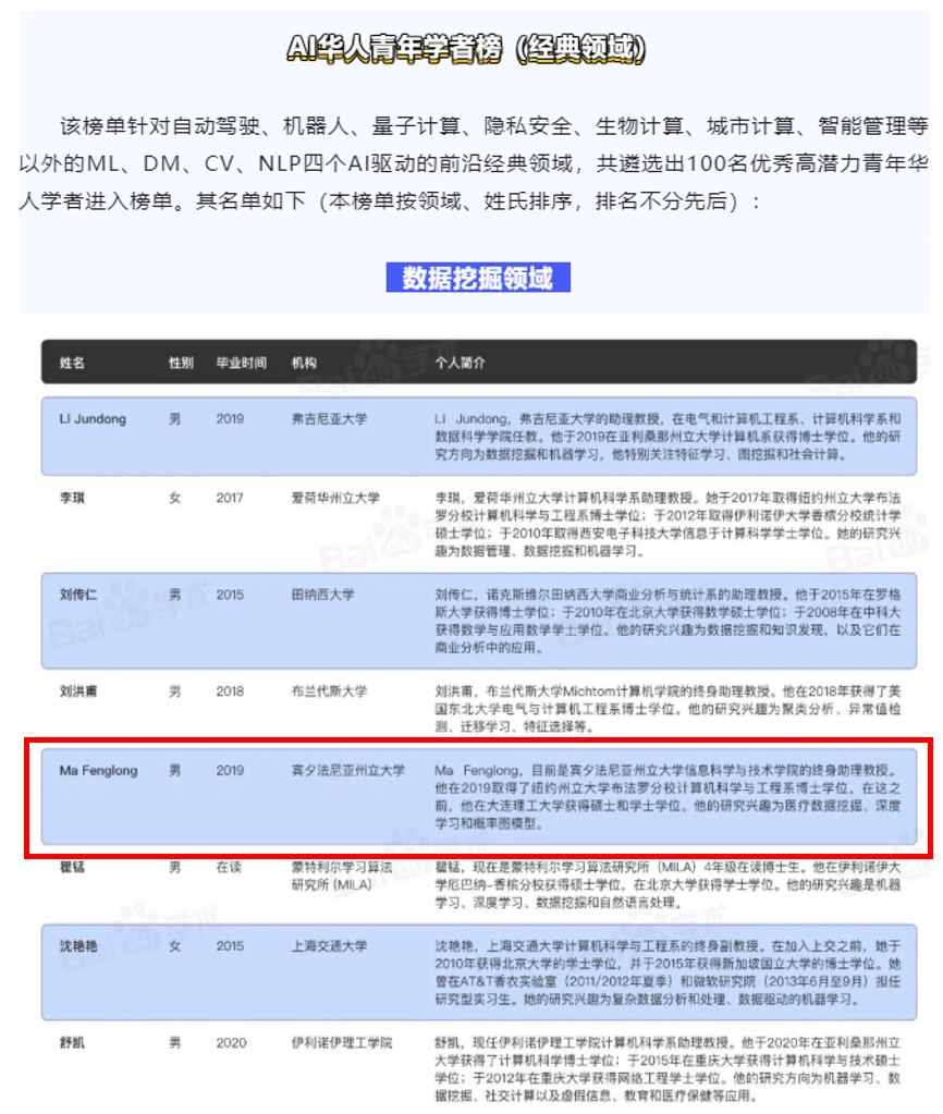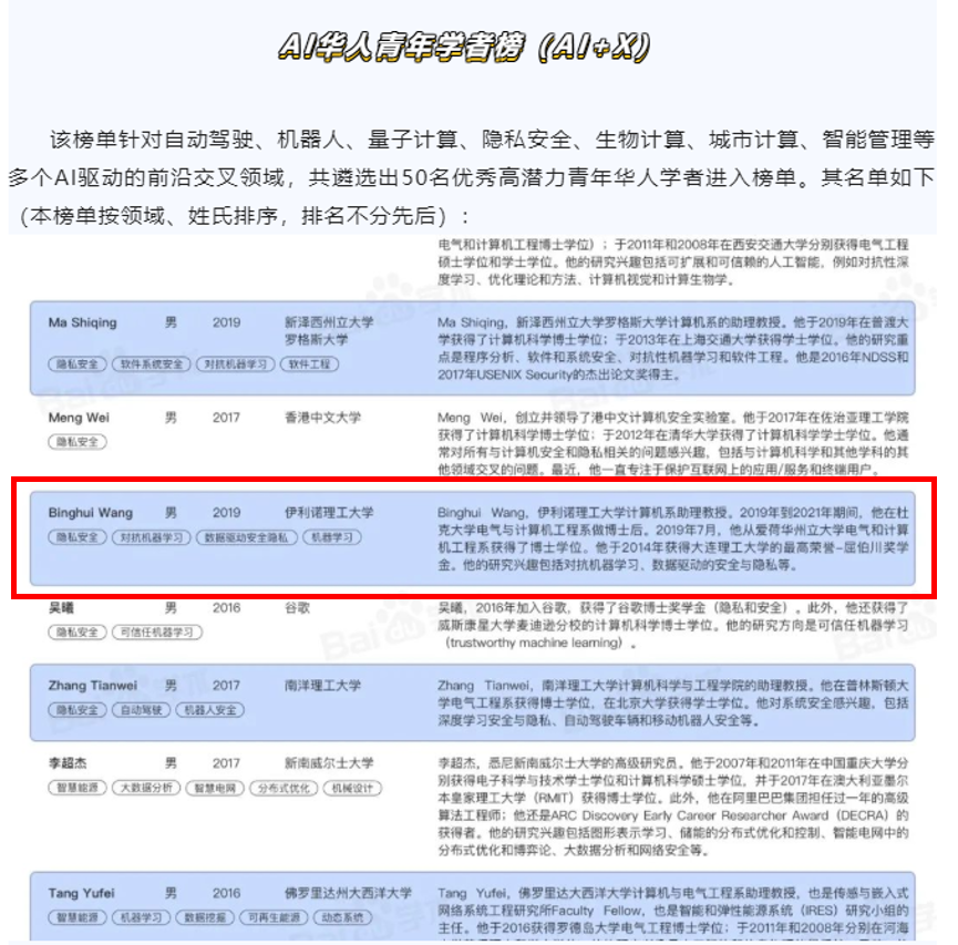 注:高潜力AI华人青年学者榜单来源自百度学术