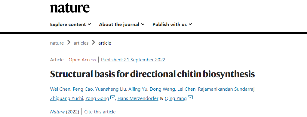 10月13日,最新一期出版的世界顶级期刊《自然》(Nature)发表了中国农业科学院/大连理工大学生物工程学院杨青教授团队和中国科学院龚勇研究员的重要研究成果:通过解析大豆疫霉菌几丁质合成酶的冷冻电镜结构,首次揭示了几丁质生物合成的完整过程,并阐明了尼克霉素抑制几丁质生物合成的机制。这是我国农药研究领域首篇发表在《自然》的论文。