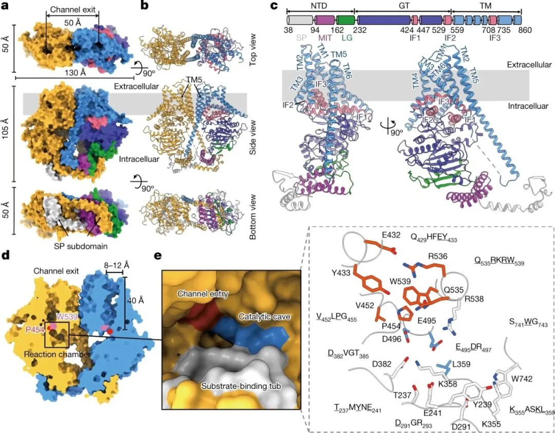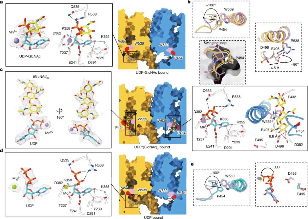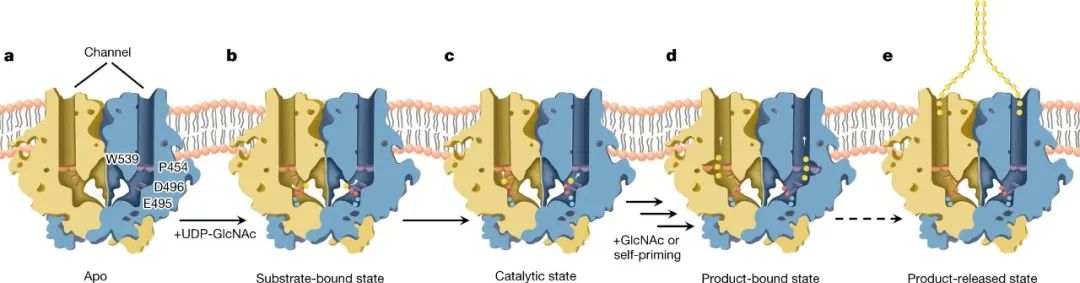 针对这一问题,杨青教授团队通过冷冻电镜技术解析了4个不同催化状态的几丁质合成酶三维结构,它们分别代表了酶的自由状态、与底物结合状态、几丁质链结合状态以及产物结合状态。该研究首次揭示了几丁质合成酶的工作机制:几丁质合成酶首先将供体底物上的糖基转移到受体几丁质糖链上,之后新生成的几丁质糖链通过细胞膜上的“跨膜转运”通道释放到细胞外,释放的几丁质链最后自发组装成几丁质纳米纤维。