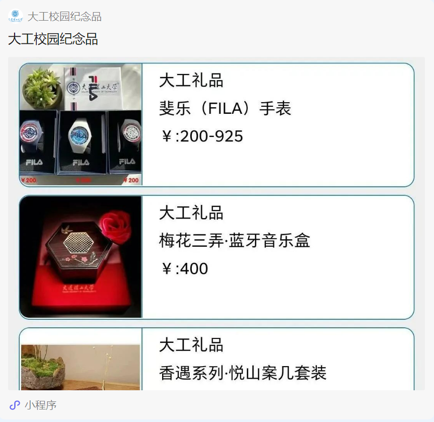 大工校园纪念品商店是由大连理工资产经营有限公司管理,经校长办公会授权的大连理工大学注册商标独家经营单位。销售具有大工文化标识的校园纪念品商务礼品生活用品及定制类礼品等百余种商品。“大工校园纪念品”小程序里全品类大工文创产品在售!样式更多!