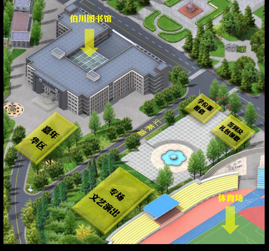 主活动区:音乐喷泉旁草坪+伯川图书馆南侧广场