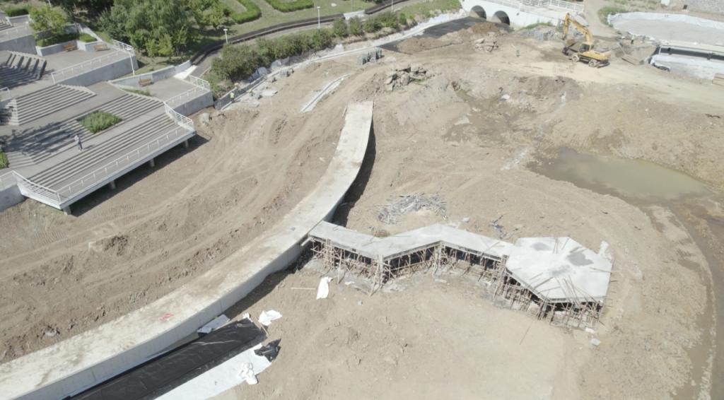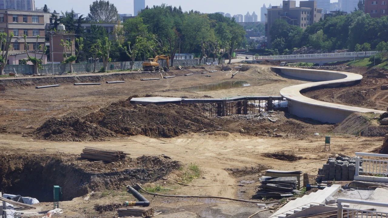 目前进度:围绕景观湖面和人流动线规划漫步道与慢跑道,现已完成河湖交接步道部分的主体工程。